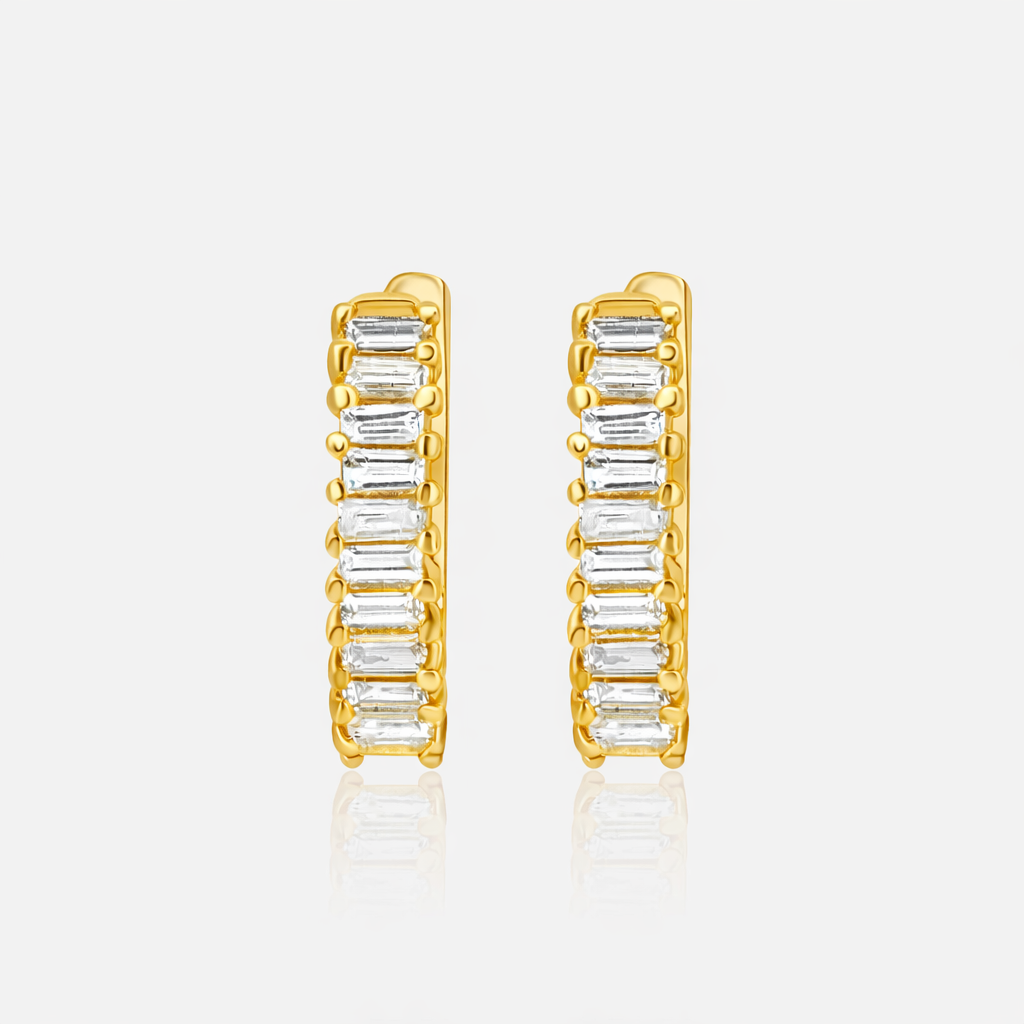 These 18K yellow gold baguette hoops are essential for the woman who wants her jewelry to be as bold and unique as she is. Secure your pair today and bring a touch of golden brilliance to your daily rotation.