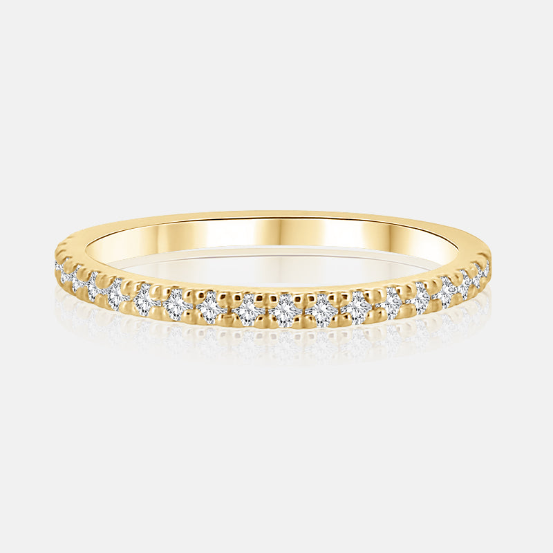 This delicate pavé diamond band offers a warm, sophisticated sparkle that perfectly balances classic tradition with modern style. Crafted in rich 14K yellow gold, it features 0.33 carats of natural round diamonds meticulously set in a refined pavé arrangement. The slim, dainty profile is designed to provide a golden glow that beautifully frames your engagement ring.