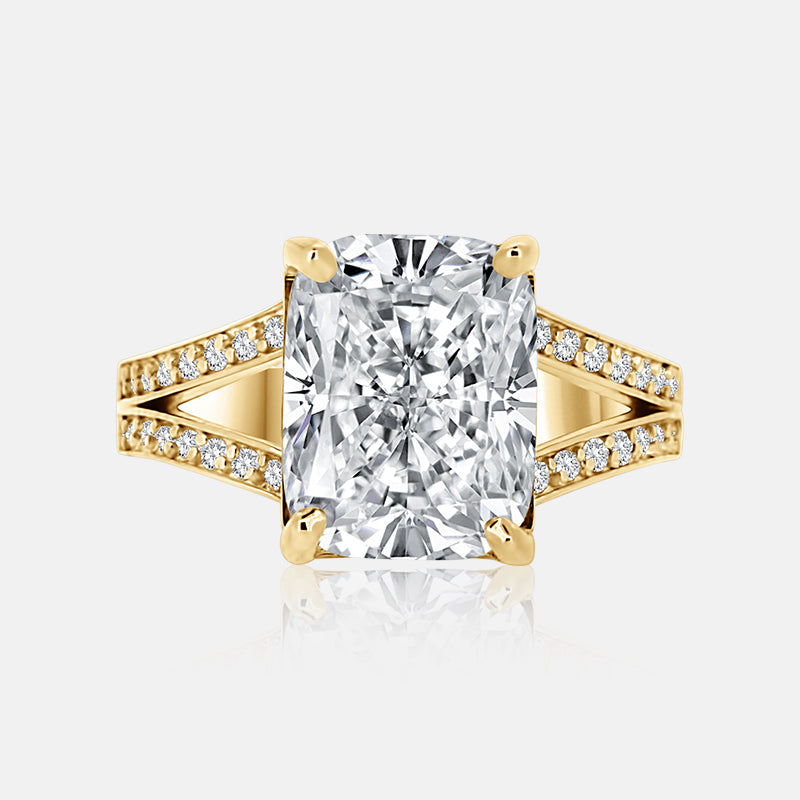 This ring commands attention with its balance of strength and refinement. At the center, a 5.10 carat lab-grown cushion-cut diamond in F color and VVS2 clarity radiates crisp brilliance and graceful fire. The setting features a split shank of 14K yellow gold, its clean lines channel set with diamonds that lead the eye toward the centerpiece. Together, the bold proportions and thoughtful details create a ring that feels modern, structured, and timeless all at once.