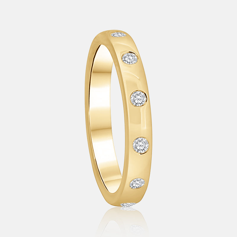 Subtle, timeless, and made to shine alongside your journey. This 14K yellow gold wedding ring features .15 carats of lab-grown diamonds, each about F color and VS clarity. Set low into the band, the diamonds add a gentle shimmer without overpowering, creating a perfect balance of elegance and wearability.